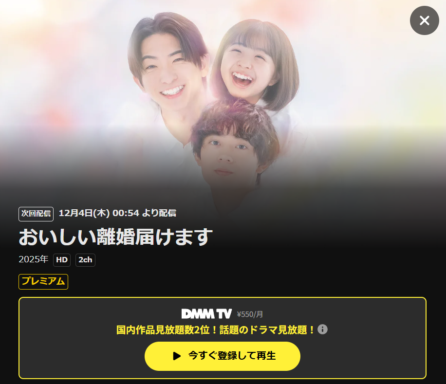 この記事では、ドラマ・おいしい離婚届けますを無料配信しているDMM TVの無料体験利用方法と、料金、他コンテンツの詳細をまとめてます。