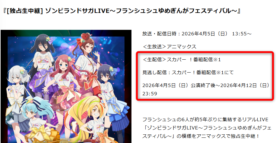 CSのアニマックスでゾンビランドサガLIVEが放送・配信されます。